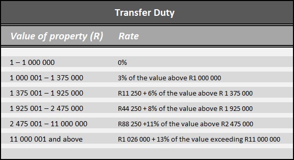 •    Transfer duty: Unless there’s VAT on the sale, the sale agreement will almost certainly also require you to pay the transfer duty, which is a government tax on property sales. No duty is payable on a property valued up to R1m and a sliding scale applies to houses above that threshold as per the table below –